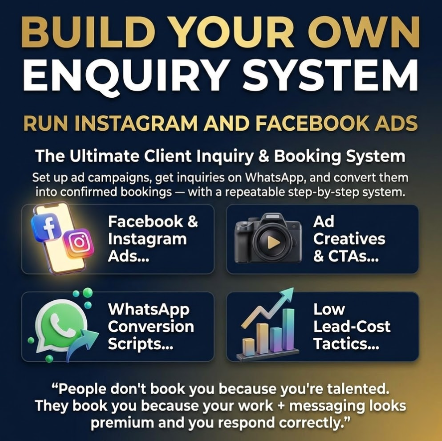 Set up ad campaigns, get inquiries on WhatsApp, and convert them into confirmed bookings — with scripts, creatives, and a step-by-step system you can repeat.